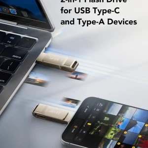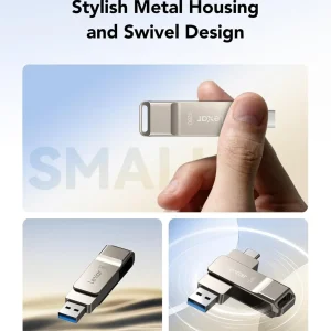This high-performance dual USB flash drive offers versatile storage solutions for modern devices. Key features include: 1. **Dual Connectivity**: Equipped with both USB Type-A and Type-C connectors in a slim, portable design, ensuring compatibility with a wide range of devices including smartphones, tablets, laptops, and traditional computers. 2. **Fast Transfer Speeds**: Achieves transfer speeds up to 100MB/s based on internal testing (performance may vary depending on host device and usage conditions), allowing quick file transfers for photos, videos, documents, and more. 3. **Plug-and-Play Convenience**: No software installation required; simply plug into your device and start using it immediately. The 360° swivel design enables easy switching between connectors without the risk of losing a cap. 4. **Durable Construction**: Features a sturdy metal enclosure that withstands temperatures from 0°C to 50°C (32°F to 122°F). Lightweight at just 26g with compact dimensions of 70.4 x 16.9 x 11.7mm, making it ideal for on-the-go use. 5. **Enhanced Security**: Includes advanced security software with 256-bit AES encryption to protect your sensitive files from unauthorized access. 6. **Reliable Warranty**: Backed by a comprehensive limited warranty for added peace of mind. Ideal for professionals, students, and anyone needing reliable storage across multiple devices.