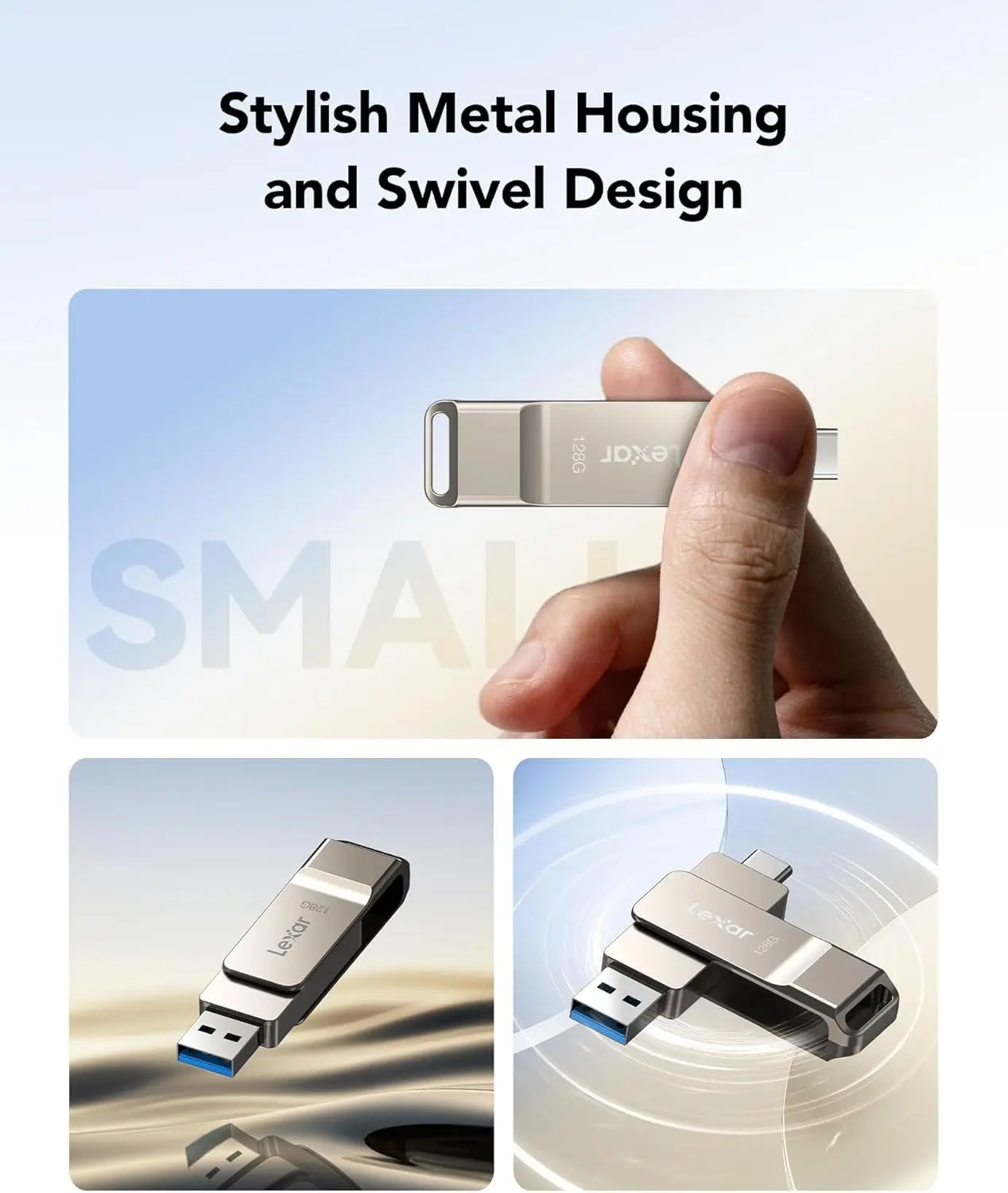 Description: 128GB Dual USB 3.2 Type A and USB Type-C Flash Drive, Metal Swivel Design Thumb Drive for Smartphones & Laptops