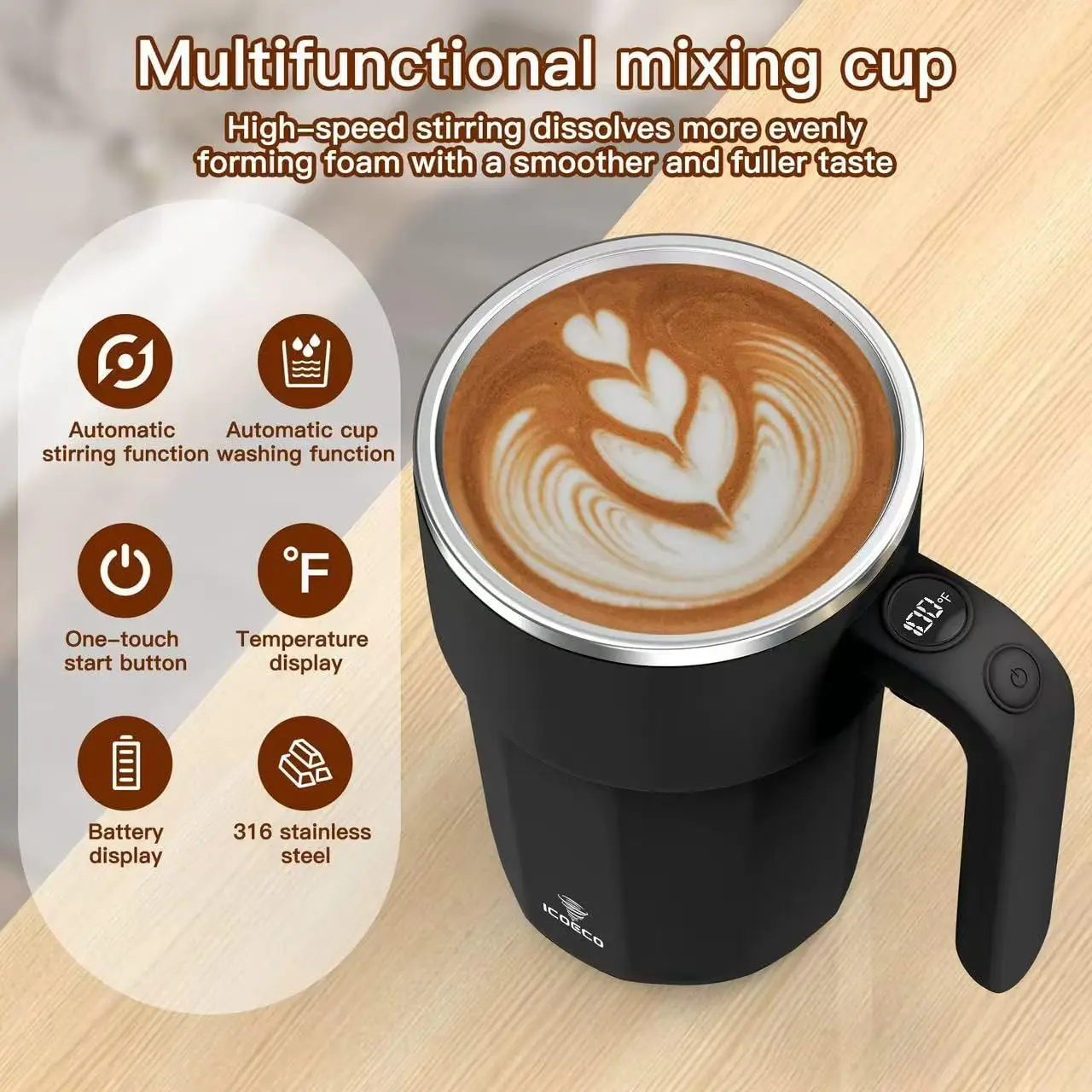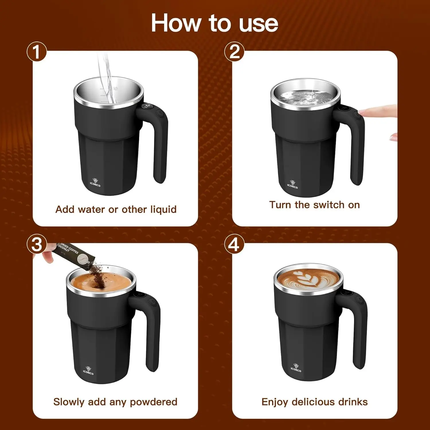Type: Self-stirring, 12oz electric mixing mug.